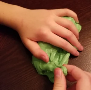 As an OT, my secret weapon is theraputty. Theraputty has a non-sticky, smooth texture that makes it more appealing than play dough and it never dries out. I hide about 20 pony beads in a cup of it and have the child spend about five minutes digging out the beads, then have the child hide them again by pinching the putty over them. Two exercises for the price of one! There is something kids just love about this stuff so they don’t realize it is an exercise.