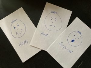 You may wish to create cards to use for this game. For each card, you can write on it a feeling and draw a simple face as an example or reminder. Take turns drawing cards and trying to get the other person to guess what your card says.