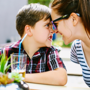 Next, play a game where you and your child sit facing each other. Take turns making a facial expression and guessing what the other person is expressing.
