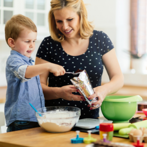 So, let’s pretend you have made cookies together before and are going to bake cookies today. Before reading the recipe together, ask your child, “What do you think we will need?” and tell them to “Go get out those things.” Yes, your child may get out extra items, but you can always put them away later. Actually, having your child help put away what they didn’t need can help them make brain connections about what they did and didn’t use while making cookies. However, don’t jump to that step. First, make the cookies and just try to leave on the table what you don’t need so it can be put away clean when you are done.